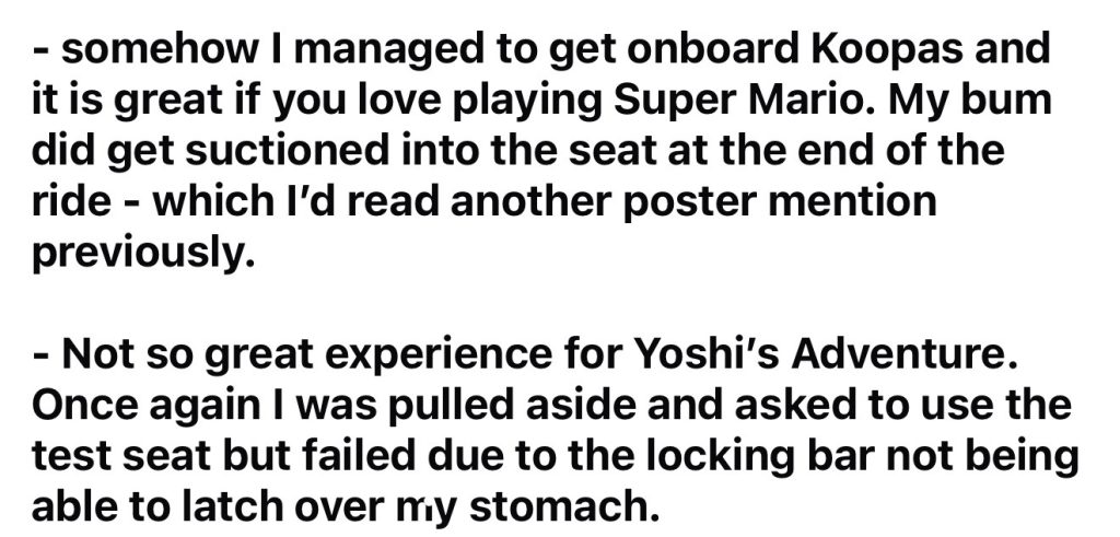 I’m 5’11”, weigh 220 lbs, wear size 16/18 US pants and XL t-shirts, and carry my weight pretty evenly. …I was able to fit comfortably on every ride I tried. I rode Harry Potter and the Forbidden Journey, Flight of the Hippogriff, Mario Kart: Koopa’s Challenge, Yoshi’s Adventure, Donkey Kong, The Flying Dinosaur, Despicable Me Minion Mayhem, Hollywood Dream, Spy X Family, and Jaws—all without any issues – Anonymous